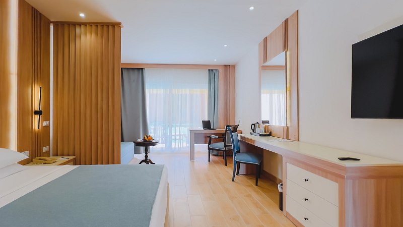 46-50 qm, Doppel, Deluxe, Meerblick, Doppelbett, 1 Bad, Dusche, WC, Haartrockner, Fliesen, Klimaanlage, Korridor/Flur, Minibar kostenpflichtig, Safe, 1 TV (Sat-TV, deutschsprachiges Programm, landestypisches Programm, sonstiges Programm, Flachbildschirm), Balkon oder Terrasse