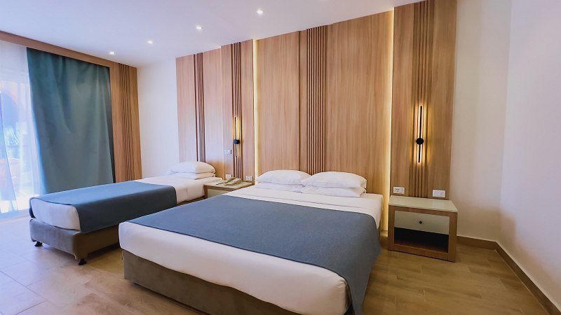 61-70 qm, Familien, mit Verbindungstür, mit Zustellbett, Superior, Poolblick, 2 separate Schlafzimmer, Twinbett, Doppelbett, Sofabett, 1 Bad, Dusche, WC, Haartrockner, Fliesen, Klimaanlage, Minibar kostenpflichtig, Safe, 1 TV (deutschsprachiges Programm, landestypisches Programm, Flachbildschirm), Balkon oder Terrasse