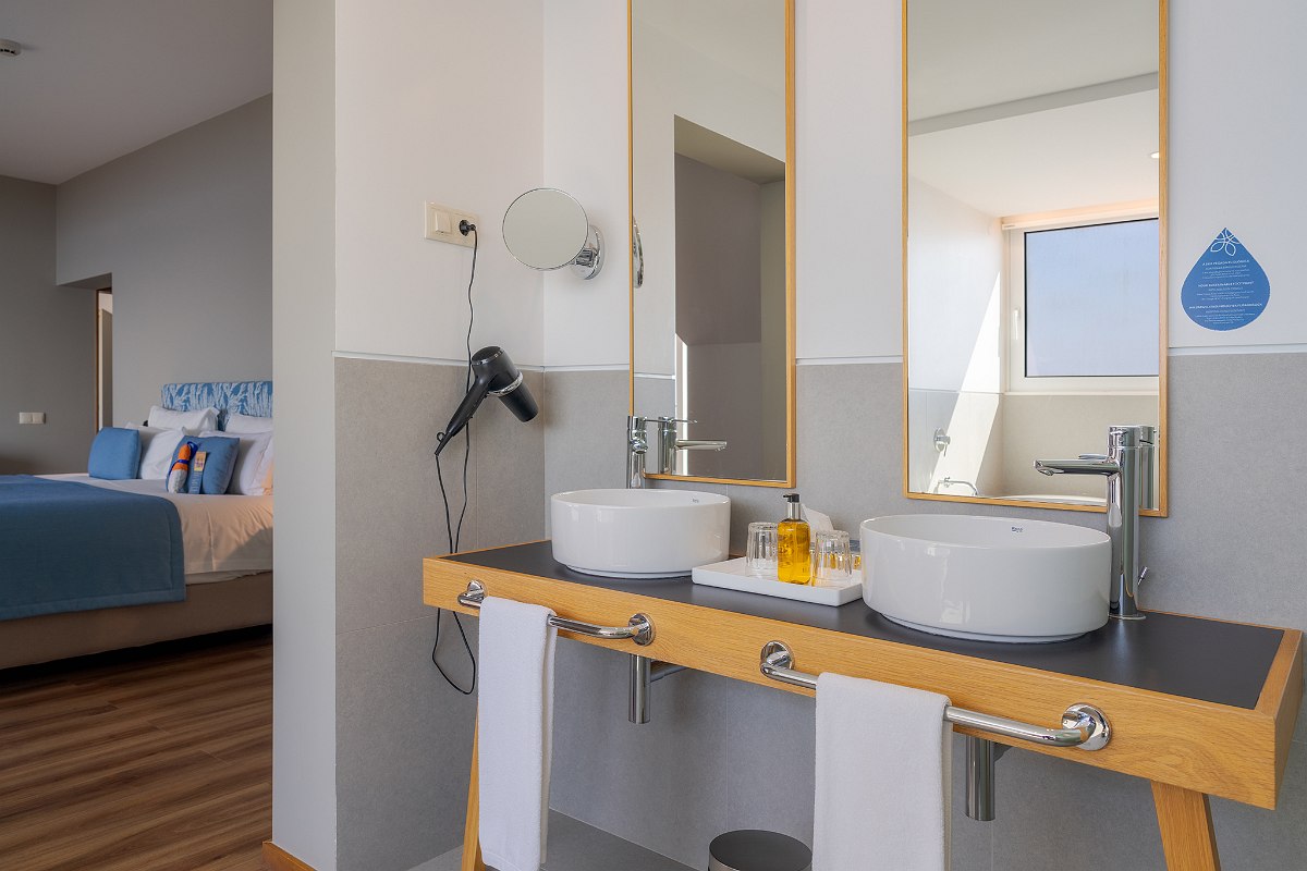 28 qm, Meerblick (seitlich), Twinbett, Balkon: Zwei Stühle und Tisch Offener Schrank Schreibtisch + Schreibtischstuhl Loungesessel und Pouf ,1 Bad, Dusche, WC, Haartrockner, Kosmetikspiegel,Haartrockner Seifenshampoo- und Duschgelspender, Klimaanlage (zentral gesteuert), Dienstleistungen gegen Aufpreis wie: Wäscheservice, Kissenauswahlliste, Minibar, Tee- und Kaffeezubereitungsmöglichkeiten, Minibar kostenpflichtig, Safe, 1 TV (Flachbildschirm, Smart-TV 40" mit internationalen Kanälen), Kostenloses Wi-Fi Steckdosen,Telefon, Wasserkocher, USB 220V Nachhaltigkeit Abfalltrennkorb Verfahren zur Wiederverwendung von Handtüchern Reduzierung des Wasserdurchflusses Toilette 1/2 Wasserabfluss , Belegung 2+1