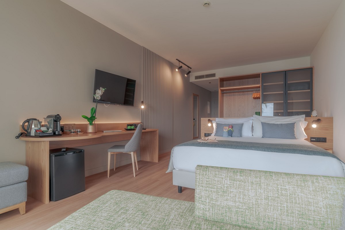 35 qm, Meerblick/seitlicher Meerblick, Queen-Size-Bett (160cm) mit Blick auf das Fenster, Balkon: Zwei Stühle und Tisch Offener Schrank Schreibtisch + Schreibtischstuhl Loungesessel und Pouf ,1 Bad, Dusche, WC, Haartrockner, Schminktisch, Kosmetikspiegel,Haartrockner Seifenshampoo- und Duschgelspender, Bademantel und Hausschuhe, Yogamatte, Klimaanlage (zentral gesteuert), Dienstleistungen gegen Aufpreis wie: Wäscheservice, Kissenauswahlliste, Minibar, Espressomaschine, Tee- und Kaffeezubereitungsmöglichkeiten, Kostenlose Flasche Wasser bei der Ankunft Kostenloses Obst bei der AnkunftMinibar kostenpflichtig, Safe, 1 TV (Flachbildschirm, Smart-TV 40" mit internationalen Kanälen), Kostenloses Wi-Fi Steckdosen,Telefon, Wasserkocher, USB 220V Nachhaltigkeit Abfalltrennkorb Verfahren zur Wiederverwendung von Handtüchern Reduzierung des Wasserdurchflusses Toilette 1/2 Wasserabfluss