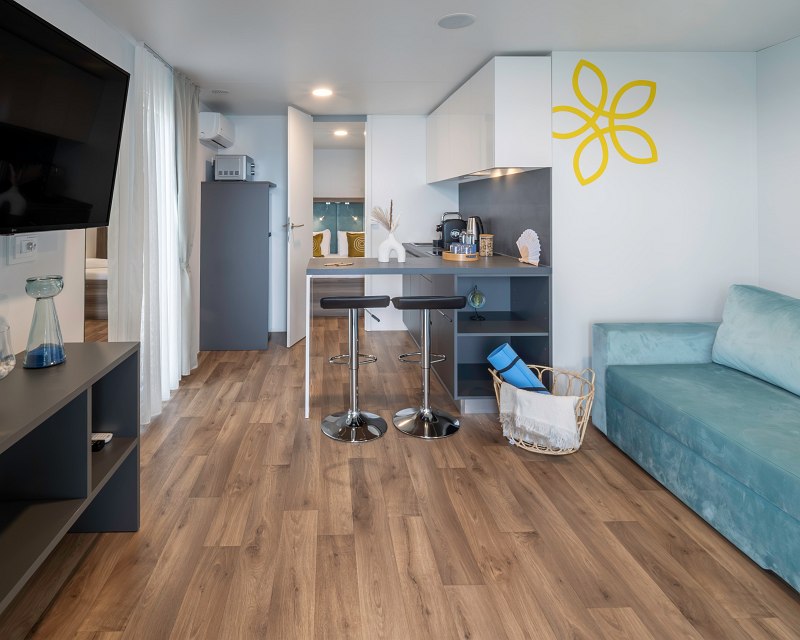 Suite, 30 qm, Seeseite, erste Seereihe, Seeblick, separates Schlafzimmer, kombinierter Wohn-/Essraum, Dusche, WC, Klimaanlage, 2 TVs (Sat-TV), Bluetooth-Lautsprecher, Kochnische, Gas-/E-Herd, Wasserkocher, Mikrowelle, Espressomaschine, Kühlschrank, Veranda (möbliert), 2 Sonnenliegen, Bettwäsche kostenfrei, Bettwäschewechsel kostenpflichtig, Handtücher kostenfrei, Handtuchwechsel kostenpflichtig, Küchenwäsche muss mitgebracht werden, Energiekosten (kostenfrei), Endreinigung (kostenfrei)