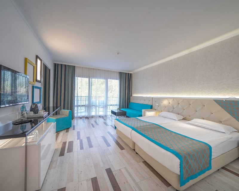 Familien, Parkblick, Nichtraucher, kombinierter Wohn-/Schlafraum, separates Schlafzimmer, französisches Bett, 1 Bad, Dusche, WC, Haartrockner, Kosmetikspiegel, Laminatboden, Klimaanlage, zentral gesteuert, Korridor/Flur, Minibar, Auffüllung regelmäßig, Softdrinks, Mineralwasser, Bier, Safe (kostenfrei), 1 TV (Sat-TV, Flachbildschirm), Telefon, WLAN, Wasserkocher, Kaffee/Tee, Balkon (möbliert), Bettwäschewechsel (2 x wöchentlich), Handtuchwechsel (2 x wöchentlich), Kopfkissen-Menü, freier Eintritt in das Strandrestaurant Moko Beach mit Mittagessen und Snacks, freier Eintritt in den Grifid Aquapark