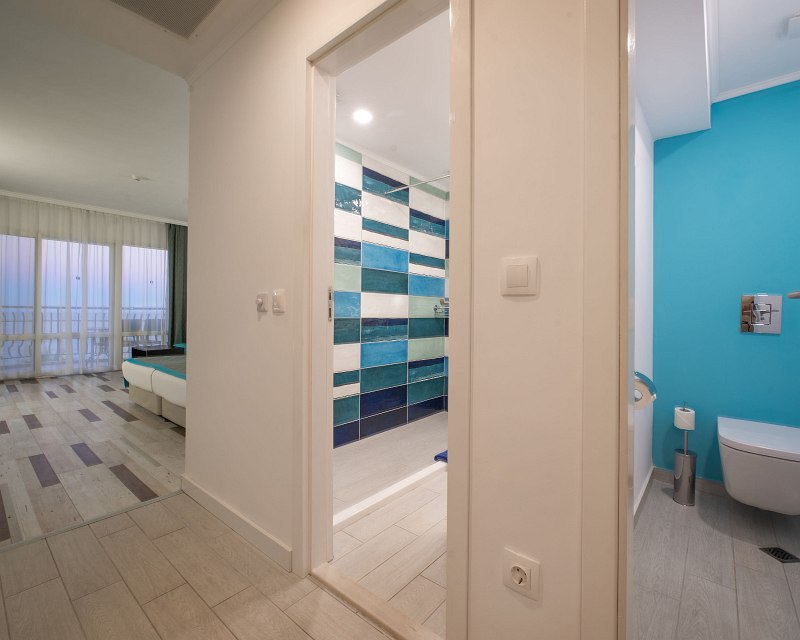 Familien, Meerblick, Nichtraucher, separates Schlafzimmer, 1 Bad, Dusche, WC, Haartrockner, Kosmetikspiegel, Laminatboden, Klimaanlage, zentral gesteuert, Korridor/Flur, Minibar, Auffüllung regelmäßig, Softdrinks, Mineralwasser, Bier, Safe (kostenfrei), 2 TVs (Sat-TV, Flachbildschirm), Telefon, WLAN, Wasserkocher, Kaffee/Tee, Balkon (möbliert), Bettwäschewechsel, Handtuchwechsel, Kopfkissen-Menü, freier Eintritt in das Strandrestaurant Moko Beach mit Mittagessen und Snacks, freier Eintritt in den Grifid Aquapark