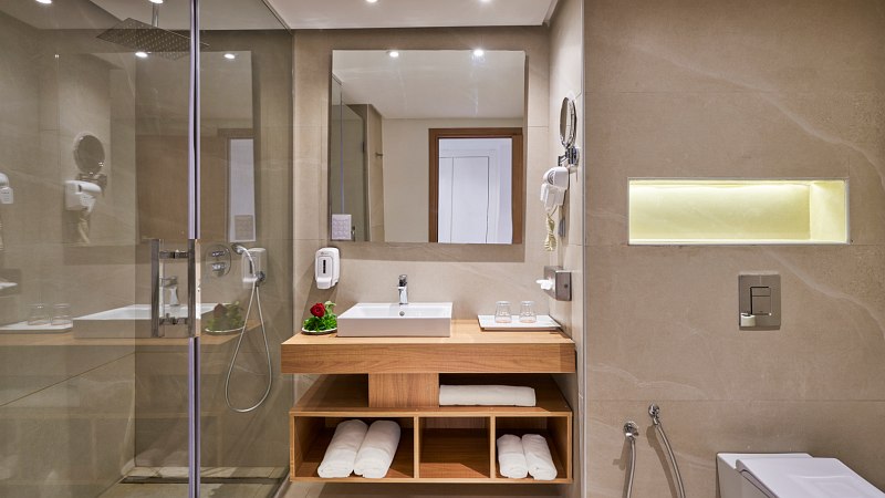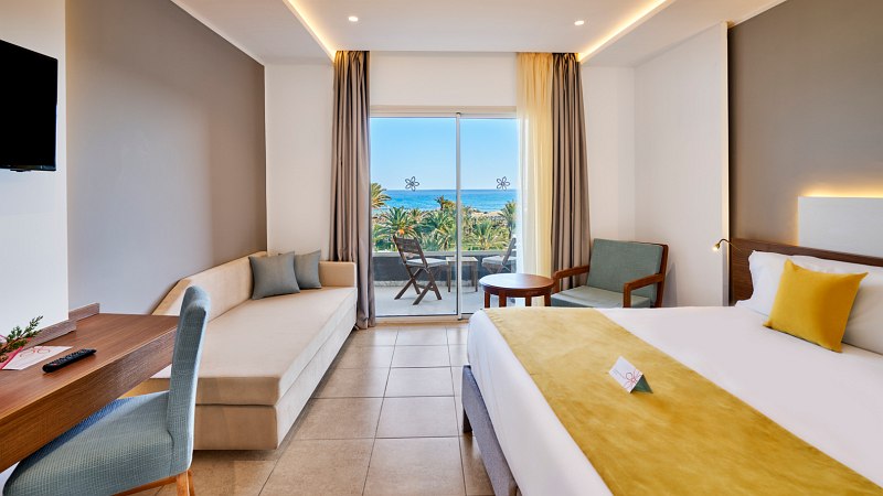 31-35 qm, 1x Schlafzimmer mit 1x Doppelbett oder 2x Einzelbetten und 1x Schlafsofa, saisonale Klimaanlage/Heizung (15.06-15. 09), Housekeeping Nachtschicht, im Hauptgebäude, Meerblick, Bettwäsche, Handtücher und Matratzen aus 100% Bio-Baumwolle, Handtuchwechsel (täglich), Badezimmer mit Dusche und WC, kostenloses Wi-Fi, Kaffee-/Teekocher, Vergrößerungsspiegel und Haartrockner, Zimmersafe, LCD-Fernseher mit internationalen Kanälen, Minikühlschrank (Auffüllung 1x p.P am Anreisetag), Zimmerservice gegen Aufpreis und Weckservice, Balkon oder Terrasse.(Rauchen und Dampfen verboten)