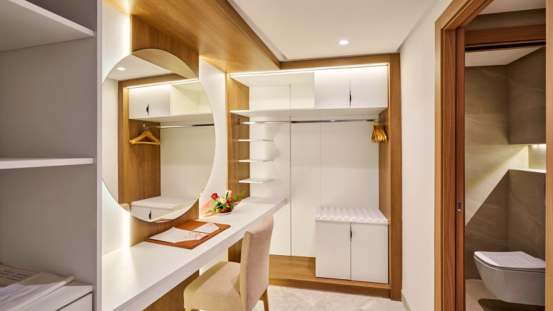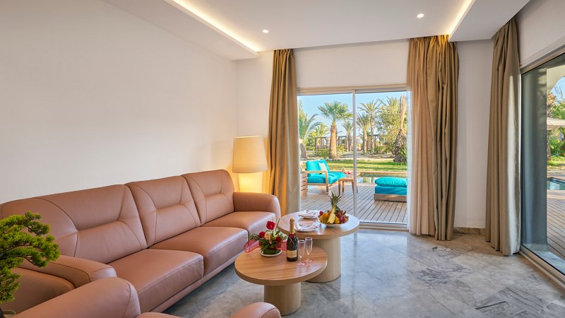 41-77 qm, 1x Großer Wohnraum gemütlicher Sitzbereich mit 2x Schlafsofas und 1x separates Schlafzimmer mit Kingsize-Bett, moderne Einrichtung mit begehbaren Kleiderschrank, saisonale Klimaanlage/Heizung (15.06-15. 09), 1x Badezimmer mit Dusche, Bademänteln und Hausschuhen, separates WC, Housekeeping-Nachtschicht, im Hauptgebäude, Poolblick, Bettwäsche, Handtücher und Matratzen aus 100% Bio-Baumwolle, Handtuchwechsel (täglich), Zimmerservice gegen Aufpreis und Weckservice, kostenloses Wi-Fi, Tee- oder Kaffeezubereitungsmöglichkeiten (Nespresso-Maschine), Vergrößerungsspiegel und Haartrockner, Safe, 2 LCD-Fernseher mit internationalen Kanälen, Minikühlschrank (Auffüllung 1x p.P. am Anreisetag), Balkon mit herrlichem Poolblick. (Rauchen und Dampfen verboten)