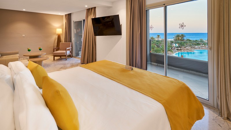 41-77 qm, Doppel, Adults-Only, offener Wohnraum, großer Sitz- und Schlafbereich, 1x Kingsize-Bett und 2x Schlafsofas, moderne Einrichtung und begehbarer Kleiderschrank, saisonale Klimaanlage/Heizung, 1x Badezimmer mit Dusche, Bademäntel und Hausschuhe, separate Toilette, Housekeeping Nachtschicht, im Hauptgebäude, Poolblick, Bettwäsche, Handtücher und Matratzen aus 100% Bio- Baumwolle, Handtuchwechsel (täglich), Zimmerservice gegen Aufpreis und einen Weckdienst, kostenloses Wi-Fi, Tee- oder Kaffeezubereitungsmöglichkeiten (Maschine Nespresso), Vergrößerungsspiegel und Haartrockner, Safe, 2 LCD-Fernseher mit internationalen Kanälen, Minikühlschrank (1x Auffüllung p.P. am Anreiseteg), geräumiger Balkon mit herrlichem Pool- und Meerblick ( Rauchen und Dampfen verboten)