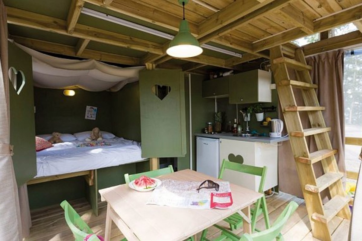 ca. 30 qm, auf 2 Etagen, Erdgeschoss 1 Doppel Cube für Kinder/Jugendliche, 1. Stock mit 1 Doppelbett, ausgestattete Kochnische mit Kühlschrank, Bad mit Dusche, WC, Klimaanlage, Holz offene Terrasse (möbliert), kein TV und keine Klimaanlage, Unterkunftsverschluss mit Reißverschluss, bis max. 4 Personen, Leiter zur oberen Etage