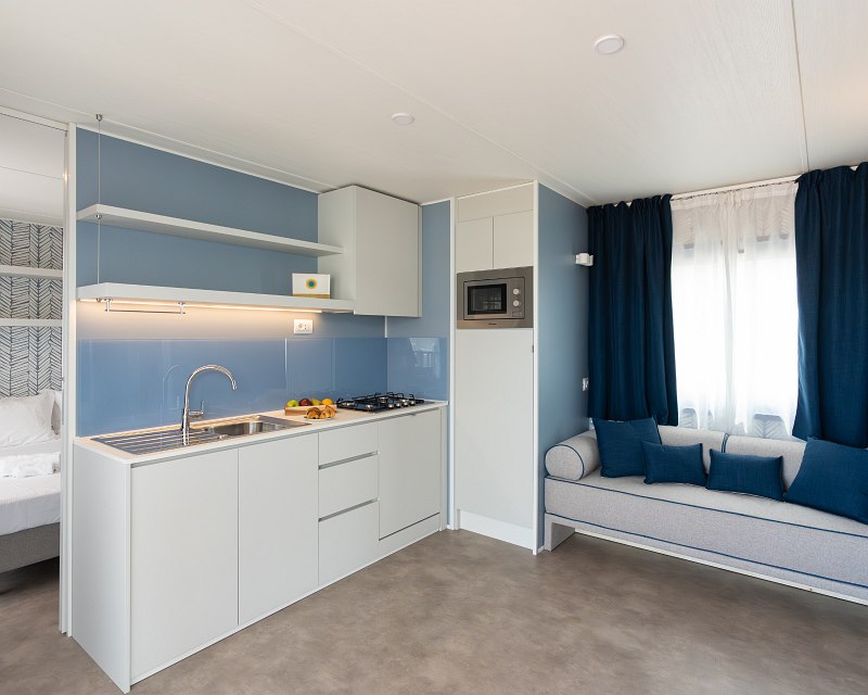 Die Kochnischen sind mit Besteck, Geschirr, Gläsern, Töpfen, Pfannen und Schüsseln, passend zur maximalen Kundenanzahl der jeweiligen Camp-Lodge Kategorie, ausgestattet. Ebenso gibt es auch ein Gefrierfach.Verfügen alle Küchenzeilen auch über einen Geschirrspüler.