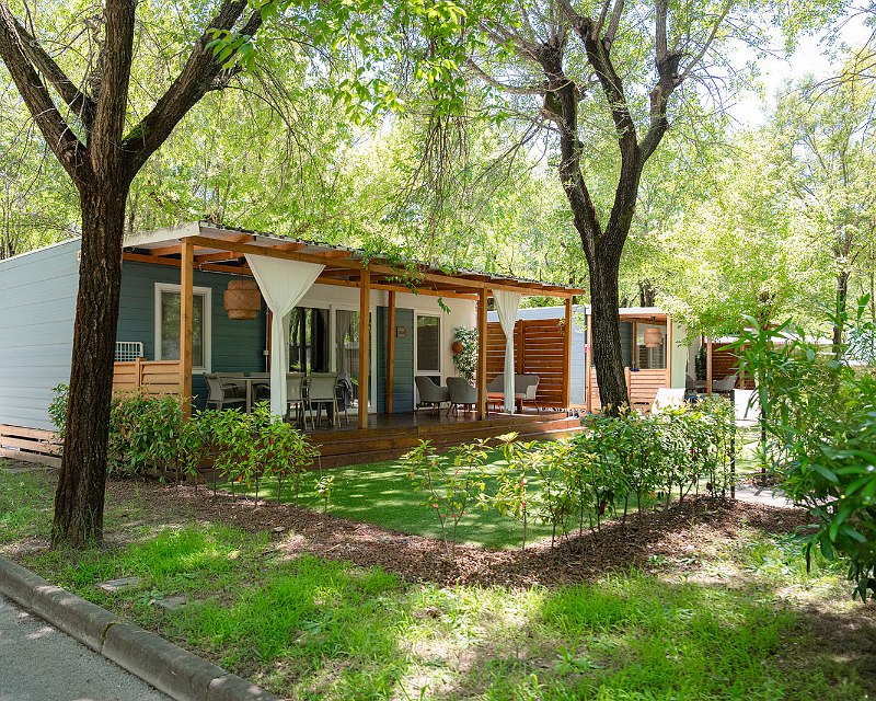 40qm, mit Veranda 50qm, 2 Doppelschlafzimmer, . Klimaanlage / Heizung, Sat-TV, 1x Wohnzimmer mit Sofa und ausgestatteter Küchenzeile, Geschirrspüler, Mikrowelle, 2x Bäder mit Dusche, Waschbecken, Toilette, Föhn und Bidet, möblierte Holzveranda und nicht eingezäuntem Garten, . Parkplatz innerhalb der Anlage (Haustiere erlaubt)