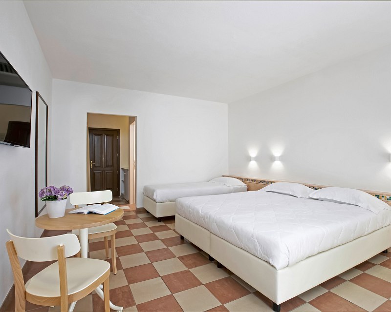 Doppel, ca. 25 qm, Erdgeschoss, Gartenblick, renoviert (2026), 1 Bad, Dusche, WC, Haartrockner, Klimaanlage, Minibar kostenpflichtig, Safe, 1 TV (Sat-TV, Flachbildschirm), WLAN, Terrasse (möbliert)