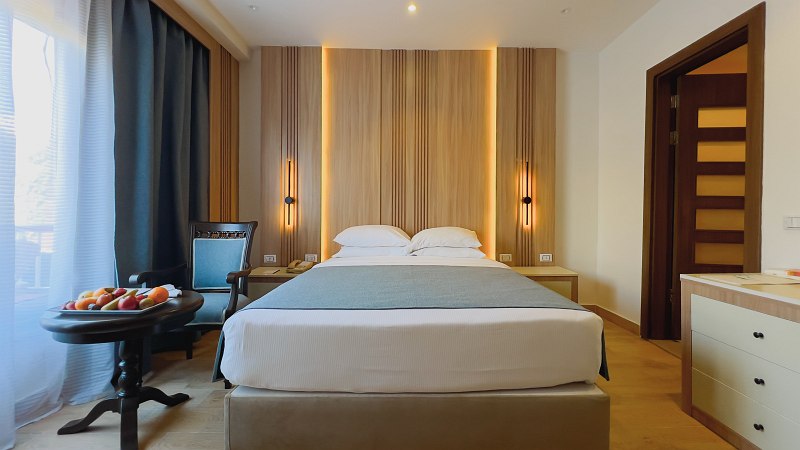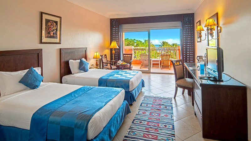 26-30 sqm, double, garden side, sitting area, double beds (1 king-size or 1 twin), 1 bathroom, shower, WC, bath slippers, hairdryer, tiles, air conditioning, minibar, refill on arrival, soft drinks, safe, 1 TV (satellite TV, flat screen), coffee/tea, late check-out (subject to availability), high-quality bathroom amenities, dinner in the specialty restaurant, laundry service (limited number), fruit, pastries, snacks in the room on arrival