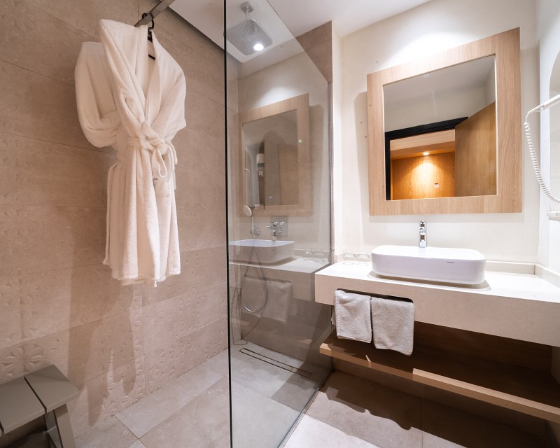 19 sqm, sea view, shower, bathrobe, bath slippers, hairdryer, air conditioning, approx. 15.06.-15.09., heating, approx. 15.12.-15.03., minibar, refill on arrival, mineral water, safe, TV (satellite TV), telephone, Wi-Fi, kettle, coffee/tea, terrace, direct pool access, shared pool