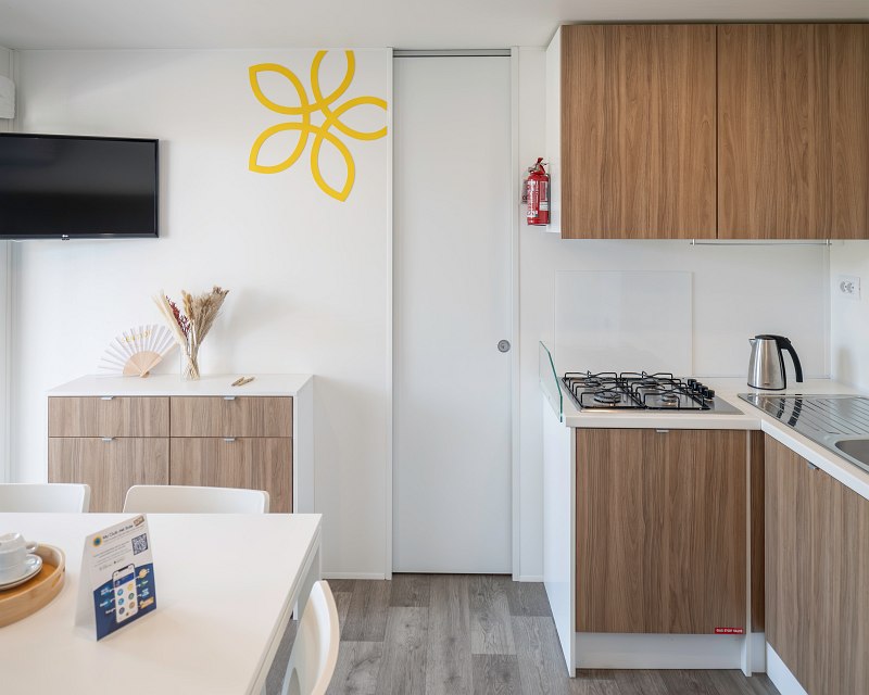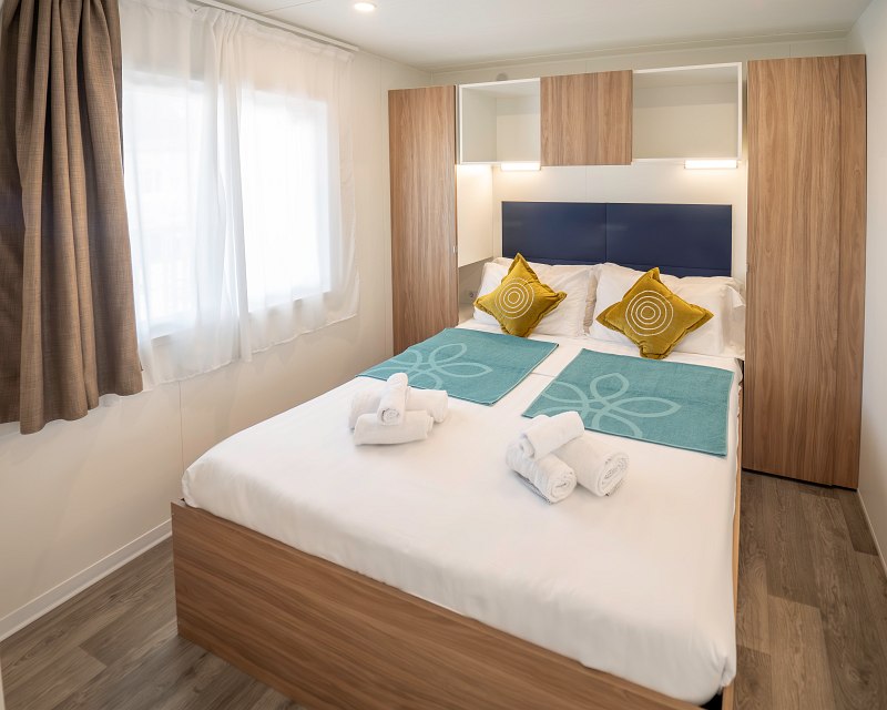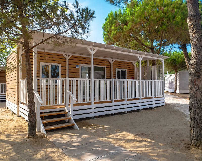 33 sqm, pets allowed, 1 double bedroom, 2 bedrooms with 2 single beds, large living room with table, chairs and sofa, fully equipped kitchen with crockery, fridge, cooker, dishwasher and TV, 2 bathrooms with toilet, washbasin, linen and hairdryer (1 bathroom with bidet), exterior closed wooden veranda with gate, air conditioning without restriction of use, modern and cosy design of the camp-lodge