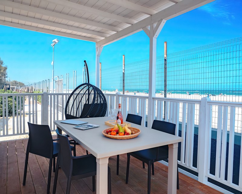 40 sqm, exclusive beach lodge with modern design and fenced veranda, pets allowed, 1 bedroom with double bed, 1 bedroom with 2 single beds and 1 bunk bed, large living room with table, chairs and sofa, fully equipped kitchen with crockery, fridge, cooker, dishwasher and TV, 2 bathrooms with WC, washbasin, shower and hairdryer (1 bathroom with bidet), enclosed wooden veranda with gate, air conditioning without usage restriction
