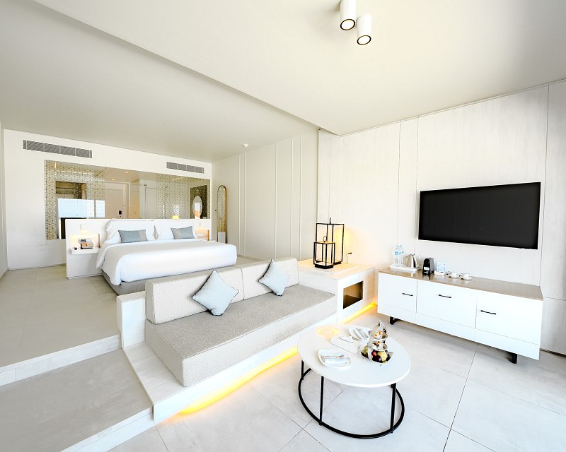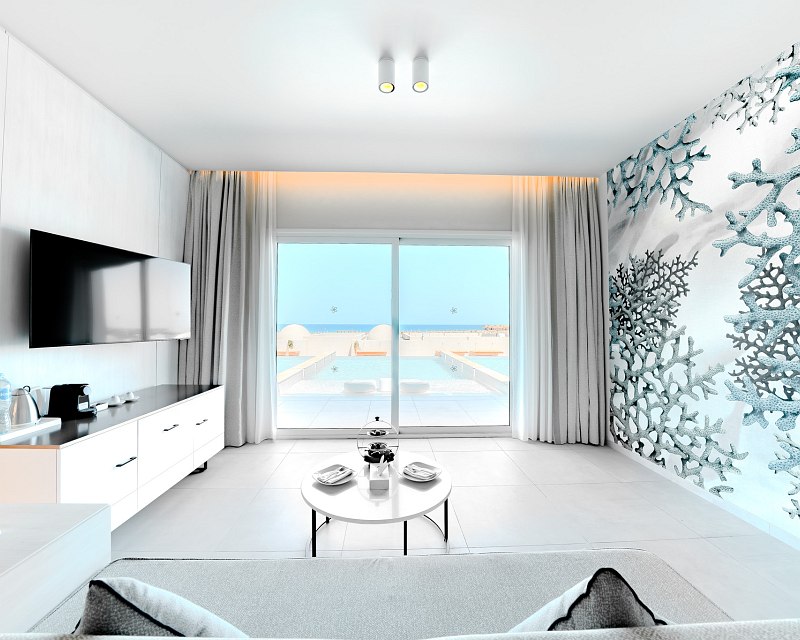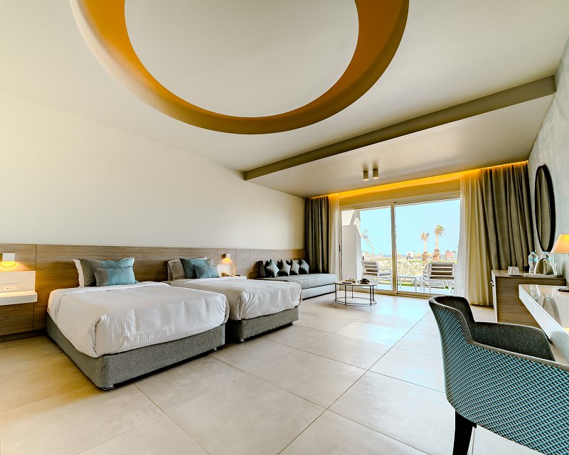 50 sqm, 2 separate bedrooms, sea, pool or garden view, renovated (2023), sofabed, shower, floor-level shower, bidet, bathrobe, bath slippers, hairdryer, vanity mirror, tiling, air conditioning, minibar payable, safe, TV (Smart TV), kettle, espresso machine, coffee/tea, balcony or terrace (furnished), privileged room service, water upon arrival in the room.