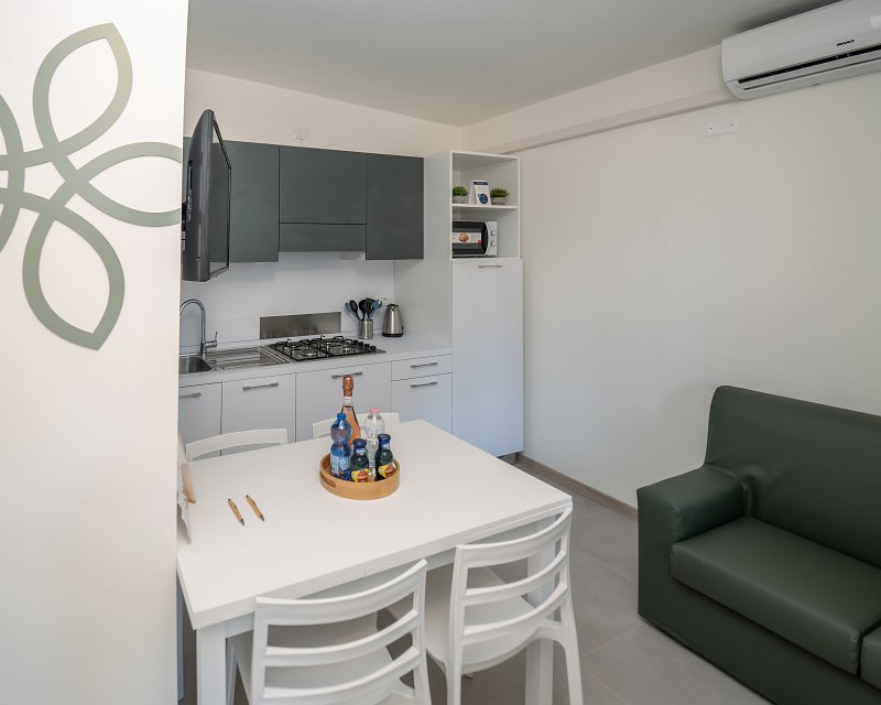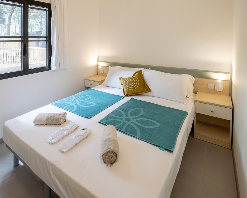 Approx. 26-37 square metres, combined living/bedroom, 2 separate bedrooms, 2 single beds, double bed, sofabed, 1 bathroom, shower, WC, air conditioning, TV, kitchenette, gas/e-stove, microwave, refrigerator, veranda (furnished). (This is a "lucky accommodation": you will be told in which category the accommodation is in on the spot, room furnishings and room size may vary depending on the category available).