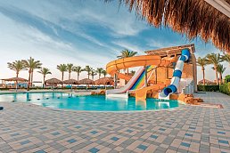 Familien können sich hier auf viel Abwechslung, tolle Wasserrutschen und einen wunderschönen, langen, flach abfallenden Sandstrand freuen.