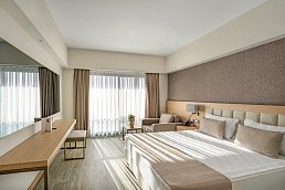 - 61-70 qm, Juniorsuite, Meerblick (seitlich), separates Schlafzimmer, separater Wohnraum, Sitzecke, Einzelbett, Doppelbett, Dusche, WC, Bademantel, Badeslipper, Haartrockner, Fliesen, Klimaanlage, zentral gesteuert, Minibar, Auffüllung täglich, Softdrinks, Bier, Safe, TV (Sat-TV, Smart-TV), Wasserkocher, Kaffeemaschine, Kaffee/Tee, Terrasse (möbliert)