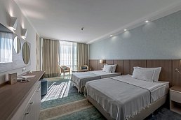 - 26-30 qm, Doppel, Hauptgebäude, Meerseite, Meerblick, Nichtraucher, kombinierter Wohn-/Schlafraum, Schreibtisch, Twinbett, 1 Bad, Dusche, WC, Haartrockner, Kosmetikspiegel, Teppich, Klimaanlage, Minibar kostenpflichtig, 1 TV (Kabel-TV, deutschsprachiges Programm, landestypisches Programm), Balkon (möbliert)