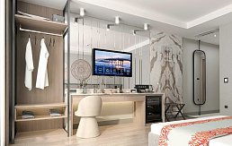 - 26-30 qm, Doppel, Superior, Meerblick, Poolblick, Doppelbetten (1 Doppel- oder 2 Einzelbetten), Dusche, WC, Badeslipper, Haartrockner, Laminatboden, Klimaanlage, zentral gesteuert, Minibar, Auffüllung täglich, Softdrinks, Mineralwasser, Bier, Wasser, Safe, TV (Sat-TV), Wasserkocher, Kaffee/Tee, Balkon, Kopfkissen-Menü